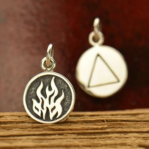 This charm features flames on one side and the Alchemical symbol for Fire on the other.