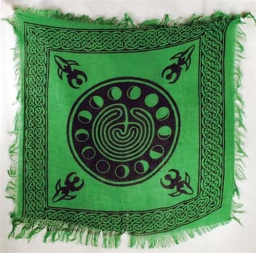 Surrounded in intricate Celtic knot designs and ancient goddess symbols, the center of this deep green altar cloth portrays an intricate spiral maze encircled in the phases of the moon.