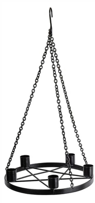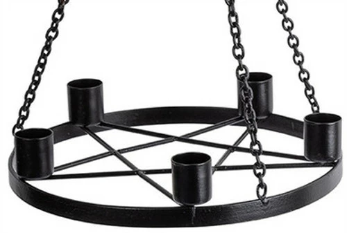 Very witchy candle holder that hangs from a chain and features a pentagram with a candle cup holder for dinner candles, at each point.