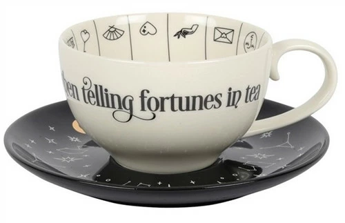 A stunning and unique bone china tea cup to be used for reading tea leaves. Features a variety of fortune telling and astrological symbols accented by gold foil, a contrasting black saucer. Comes with an information leaflet. Truly a piece to be treasured.