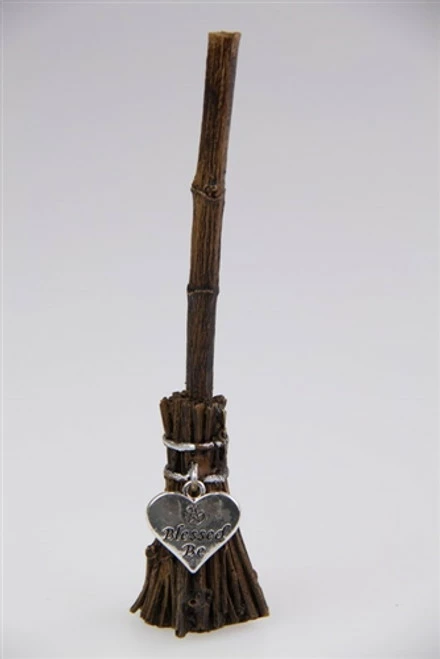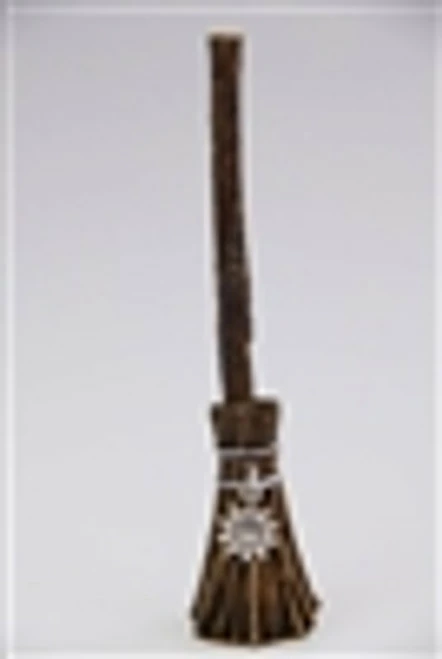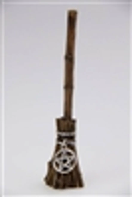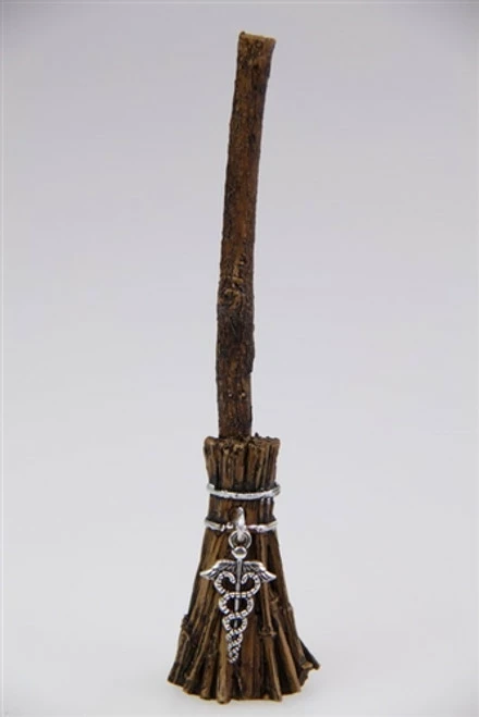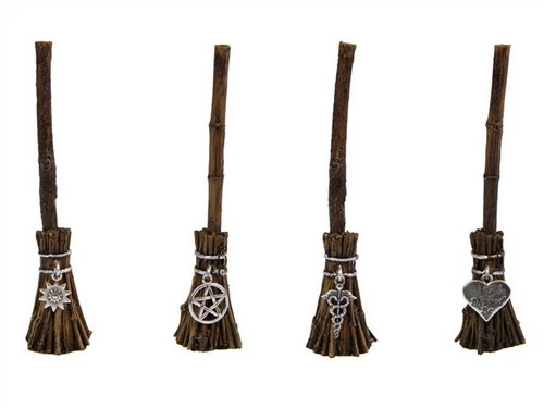 12cm Witch Broomstick Charms made of cast resin with attached silver magick symbols – assorted sun (fire energy), pentagram (earth energy), caduceus (air energy), or heart (water energy).