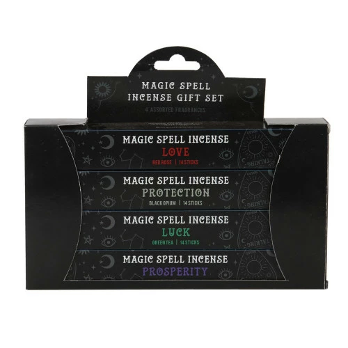 This magic spell incense gift set includes 4 individual packs of incense sticks perfect for spellwork, altars and everyday enjoyment. Each pack includes 14 incense sticks in Red Rose (Love), Black Opium (Protection), Green Tea (Luck) and Lavender (Prosperity)