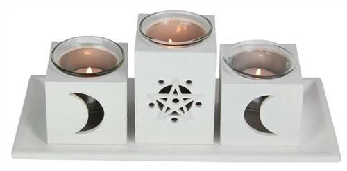 Wooden stand featuring cut out shapes in a triple moon / pentagram design that light up in the dark while the tea lights are burning. each piece is separate so great to use in lots of different ways.