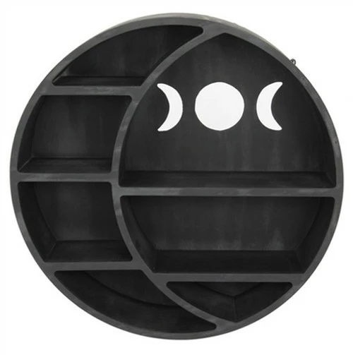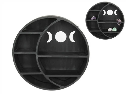 Wooden wall shelf in the shape of a full moon featuring a crescent and triple moon cut out – ready to hold crystals and sacred talismans etc.
