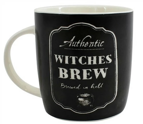 Large ceramic mug with print “Authentic Witches Brew – Brewed in Hell” and a picture of a cauldron.