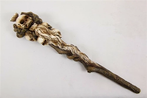 These wands are made of resin so allow a lot of detail – they are designed to look like ancient wood and feature four different designs – this one feature skulls – which could represent ancestral wisdom, and thus water energy magick